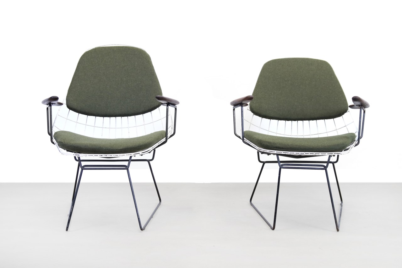 Omschrijving: Mooie originele vintage draadmetalen fauteuil van Cees Braakman en Adriaan Dekker geproduceerd door Pastoe. De FM06 is de fauteuil variant van de eetkamerstoelen SM05. De Pastoe FM06 Wire stoel werd in 1958 ontworpen door Cees Braakman. Spraakmakend aan deze stoel was dat het een van de eerste collecties werd die volledig uit draadstaal werd gemaakt. Deze modellen hebben beiden de prachtige teakhouten armleuningen en opnieuw gestoffeerde kussens in groen wol vilt. Zo worden ze vandaag de dag niet meer gemaakt. Allereerst niet in twee kleuren, en de armleggers zijn tegenwoordig van notenhout. Dit zijn de echt oude originele stoelen, die Cees Braakman wellicht zelf nog in zijn handen heeft gehad met prachtige patina aan het metaal. De fauteuils zijn 85 bij 61 bij 50 cm. De zithoogte is 36 cm.