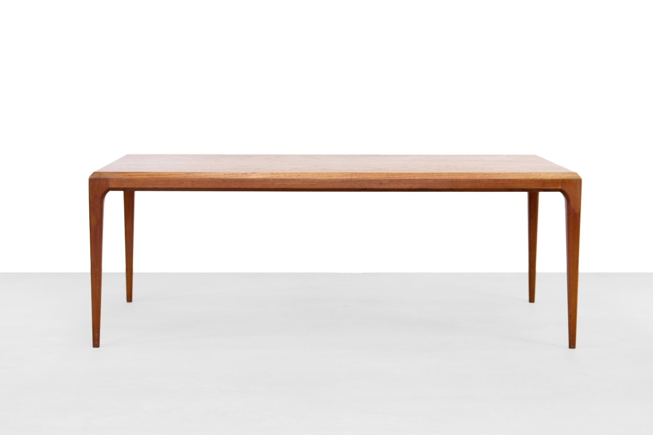 Omschrijving: Prachtig vormgegeven salontafel van Johannes Andersen voor Silkeborg Møbelfabrik. Gemaakt van massief teakhout en een teak gefineerd blad. De tafel heeft een hele minimale vormgeving, maar spreekt toch uit middels de prachtige details. Zo heeft het blad prachtige afgeschuinde hoeken, lopen de pootjes taps toe deels hoekig en deels rond af en extra speciaal aan dit model zijn de twee extra bladen die uit beide zijkanten geschoven kunnen worden. Een van de bladen teak gefineerd en de andere voorzien van zwart formica. In het formica zitten wat krasjes van het in en uitschuiven. Deze luxe versie van de Johannes Andersen salontafel is gemerkt met een metalen merkplaatje van de fabrikant CFC Silkeborg en een Danish Control waarborg. De tafel is 135 cm lang, 60 cm breed en 50 cm hoog.