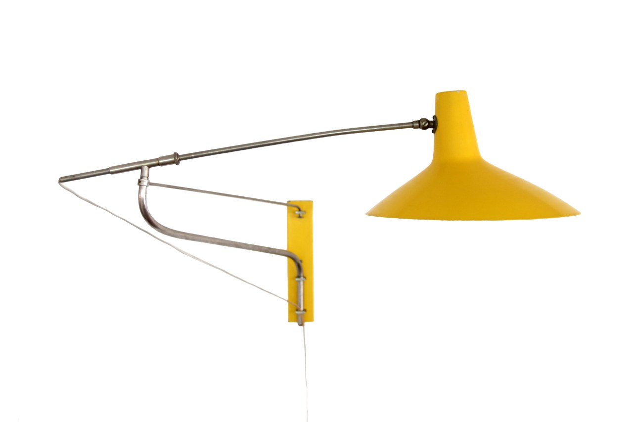 Omschrijving: Geweldige zeldzame swing-arm wandlamp van Artimeta, Nederland. Onder Artimeta ontwierpen onder andere Matthieu Mategot en Floris Fiedeldij. De gele lamp is in verschillende potities te zetten wat het een hele veelzijdige lamp maakt.