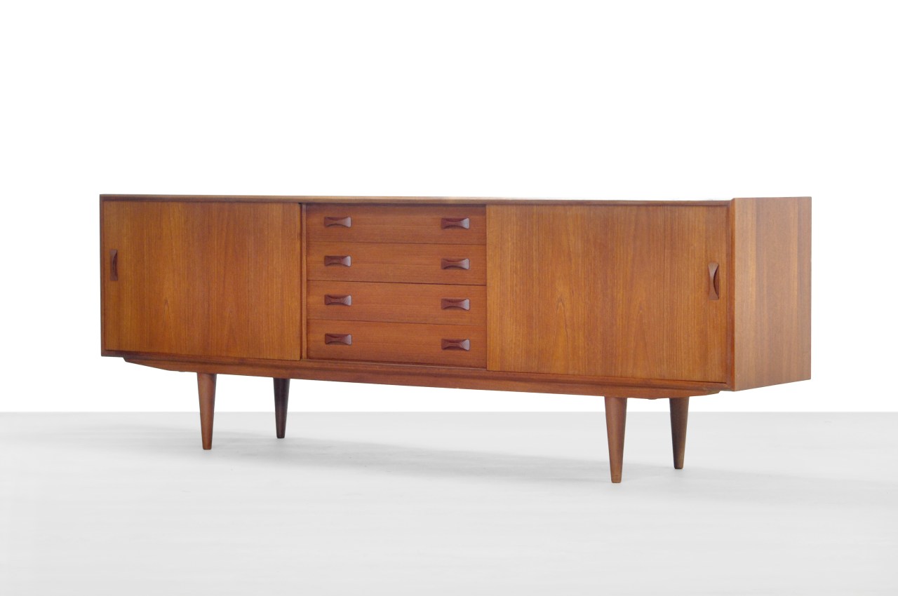 Omschrijving: Zeer mooi dressoir geproduceerd door Deense fabrikant Clausen & Son uit Silkeborg. Dit dressoir is gemaakt van teakhout. Dit dressoir is zeer mooi afgewerkt, zo lopen de randen van de deuren of de gehele kast mooi rond af. Het dressoir heeft twee schuifdeuren en vier lades, en staat op slanke conische pootjes. Dit dressoir heeft een lengte van 209 cm. Het dressoir is 45 cm diep en 74 cm hoog.