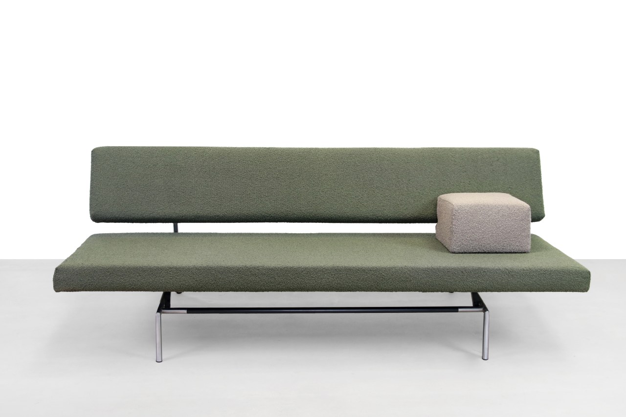 Omschrijving: Prachtige minimalistische slaapbank ontworpen door Martin Visser voor het Spectrum. Slaapbank model BR02 is ontworpen in het begin van de jaren 60, maar dit model stamt uit het eind van de jaren 80. Hierdoor is er bij deze bank ook een losse armlegger, waarmee u de indeling van de bank naar eigen wens kunt bepalen. De bank moest opnieuw gestoffeerd worden, waardoor we de bank hebben kunnen voorzien van nieuwe schuim waardoor hij zijn rechte strakke lijnen weer terug heeft. Ook hebben we gekozen voor een groene Bouclé stof om de bank mee te stofferen en een zandkleurige Bouclé voor de armlegger.