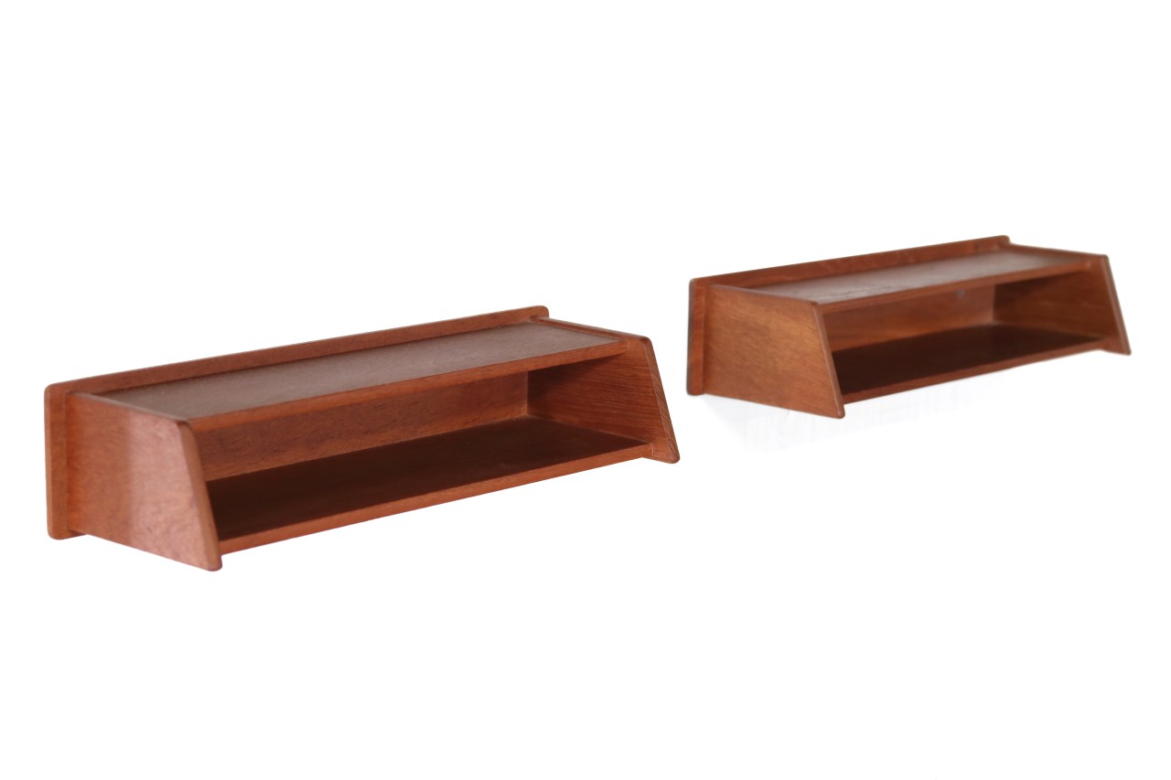 Omschrijving: Zeer mooie en minimalistische zwevende nachtkastje uit Denemarken gemaakt van teak. De kastjes worden met twee schroeven per kastje (blind) bevestigd aan de muur. Door het simpele design passen deze kastje goed in elke slaapkamer. Je kunt de ook gebruiken om onder een spiegel te hangen voor bijvoorbeeld je sleutels of een kam. Elke kastje is 42 cm breed, 14 cm diep en 10 cm hoog.