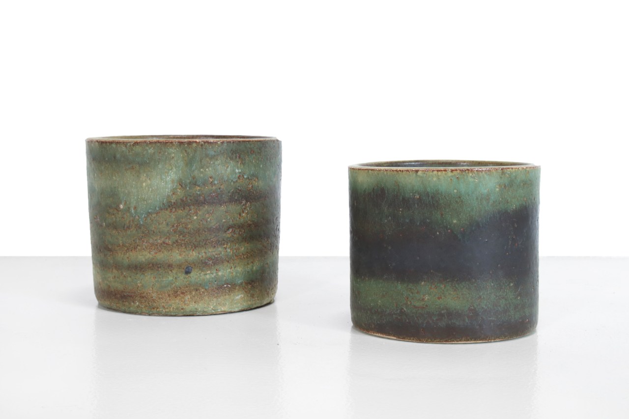 Omschrijving: Prachtige groen keramieken bloempotten in de stijl van Zaalberg of Mobach. De potten zijn van zeer goede en zware kwaliteit.