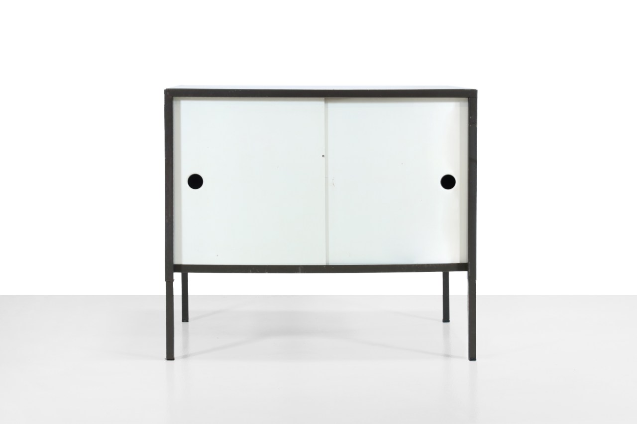 Omschrijving: Zeldzaam kastje van Coen de Vries voor Pilastro. Gemaakt van grijs en wit gelakt metaal. Super leuk minimalistisch Nederlands design kastje voor in de gang, voor je platenspeler of waar je maar wilt. Door zijn formaat is het kastje super veelzijdig inzetbaar. Het kastje heeft twee schuifdeuren met ronde greepjes wat een mooi contrast is met de rechte lijnen van het industriële kastje.