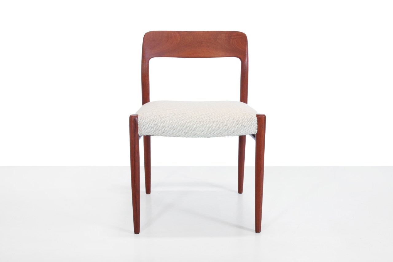 Omschrijving: Model 75 eetkamerstoel van Niels Møller uit Denemarken. Prachtige organisch vormgegeven massief houten stoel die opnieuw bekleed is in Kvadrat Coda 2 meubelstof. Deze enkele stoel is perfect te gebruiken als extra stoel aan tafel of in de slaapkamer of bijvoorbeeld als bureaustoel.