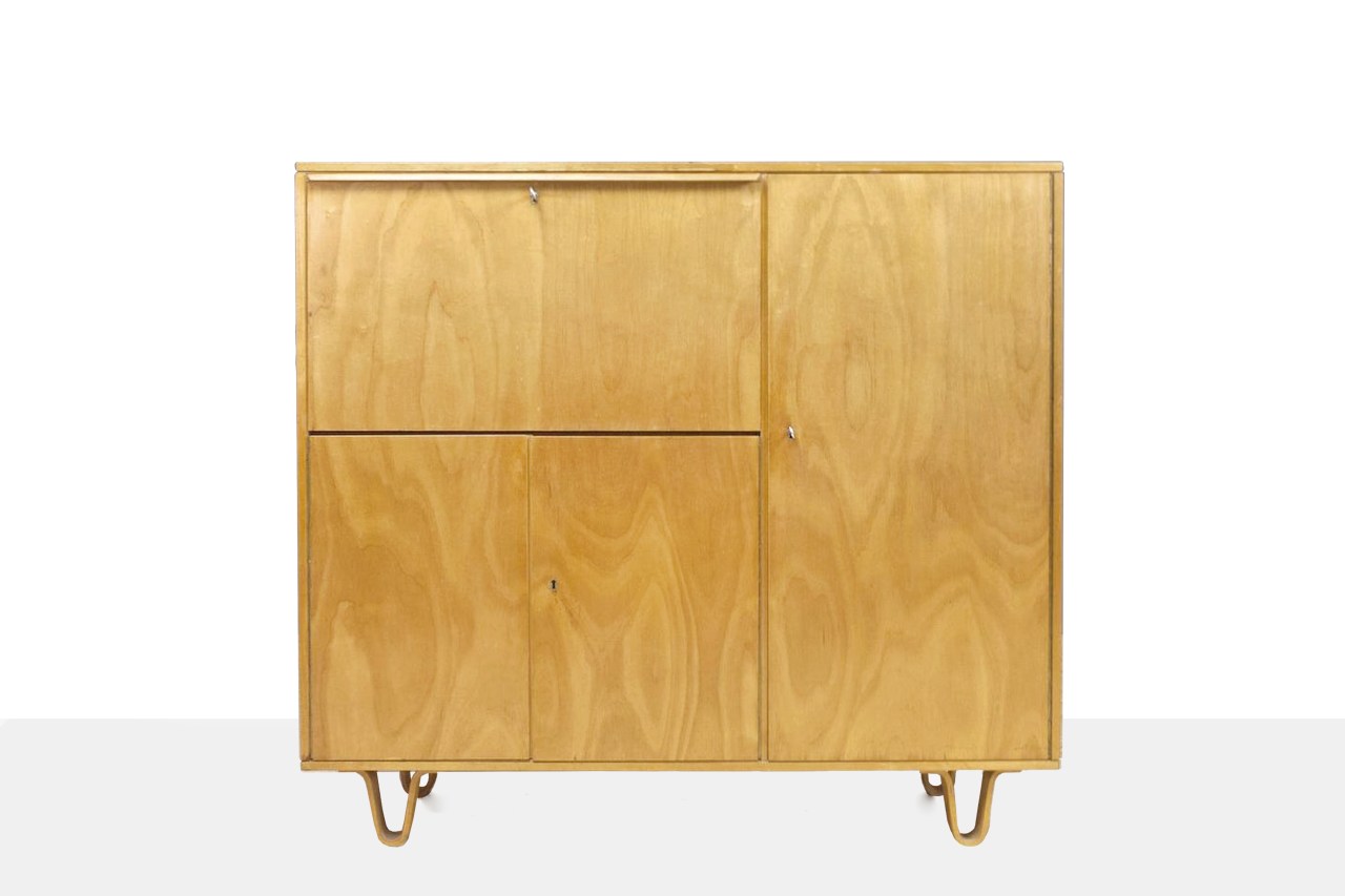 Omschrijving: Zeer mooie kast ontworpen door Cees Braakman voor Pastoe in de jaren 50. Deze kast maakt deel uit van de zogenoemde berkenserie. De berkenserie kenmerkt zicht onder andere door de prachtig gebogen berkenhouten pootjes, de gebogen plywood lades en uiteraard dat ze gemaakt zijn van berkenhout. Deze kast is behalve als opbergmeubel ook zeer geschikt om als werkplek te gebruiken. Door de klep naar beneden te klappen, ontstaat een werkblad welke gebruikt kan worden als bureau. Achter het werkblad bevindt zich een plank met een vakje met twee lades voor bijvoorbeeld pennen of papier. Als je het ladenblokje verwijderd kan je deze plek ook zeer goed gebruiken als dranken cabinet. Verder heeft de kast nog drie deuren met planken en twee grote gebogen plywood laden. Deze kast is 118 cm hoog, 131 cm breed en 43 cm diep.