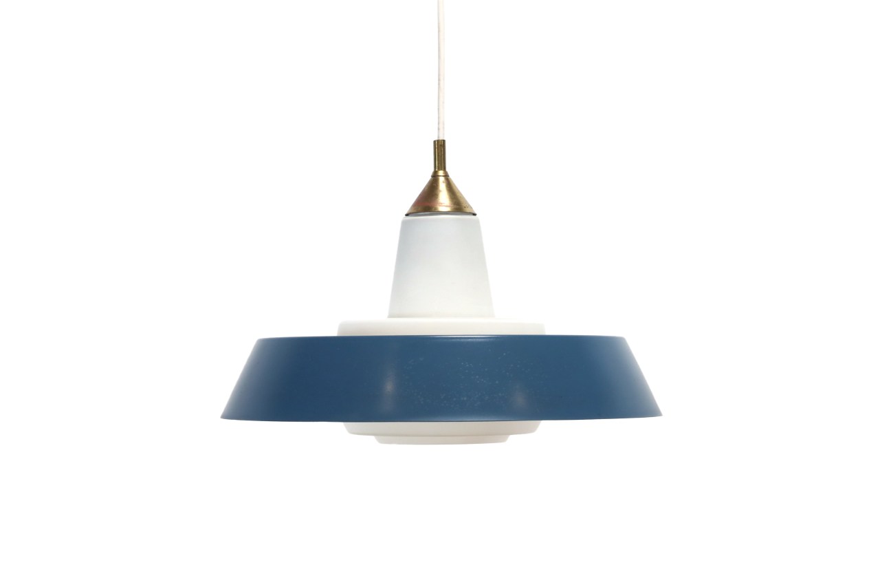 Omschrijving: Vintage Deens design hanglamp. De lamp heeft een glazen kelk waarop een blauwe metalen ring rust en een messing armatuur. Een mooie combinatie van materialen, waarbij de lamp mooi egaal licht verspreidt. De lamp is 20cm hoog en heeft een doorsnede van 45cm.