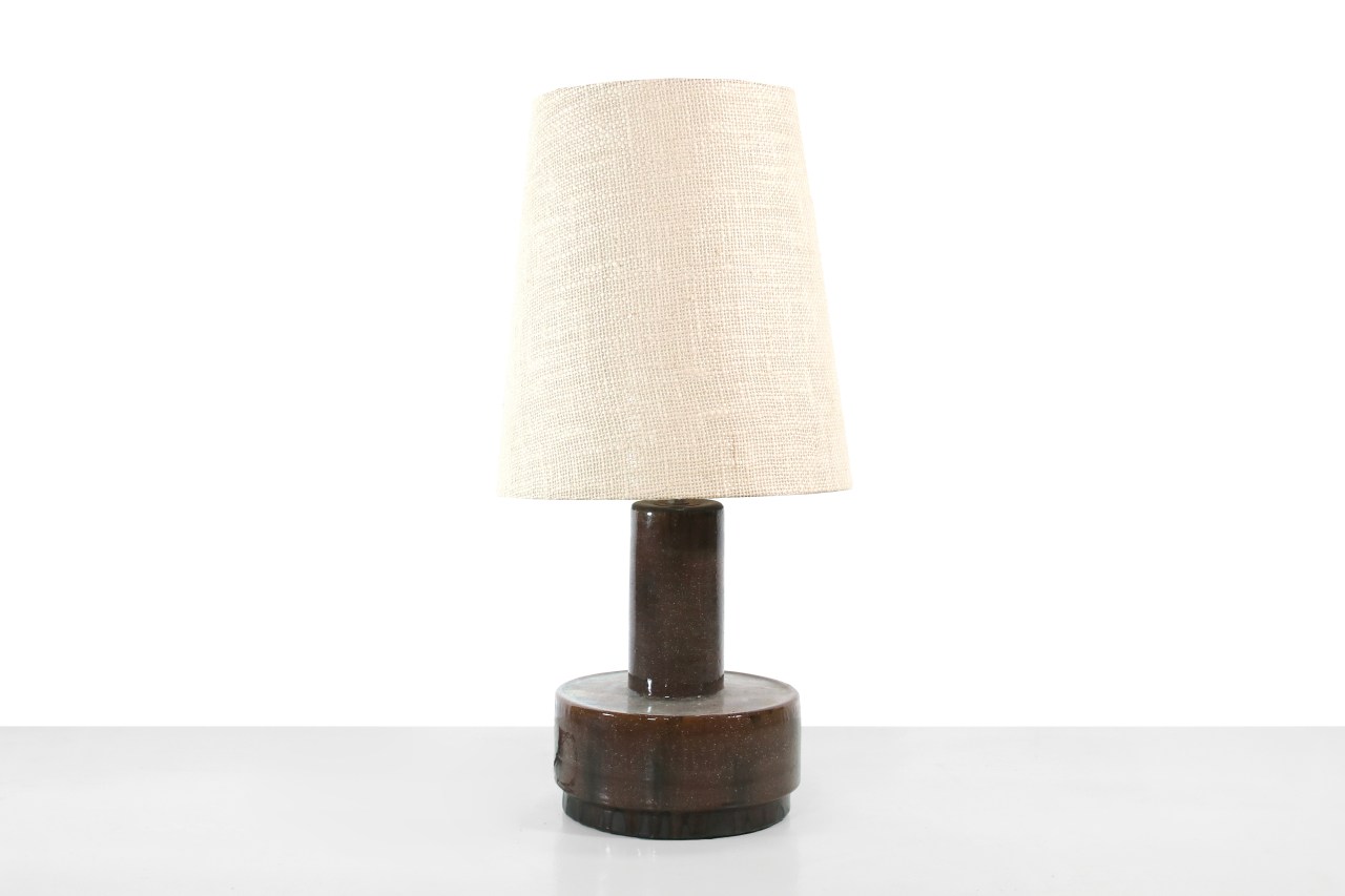 Omschrijving: Grote geglazuurde keramieken Brutalistische vloerlamp van Dijkstra lampen. De lamp voet is bruin geglazuurd met een beetje groen blauw met een mooi effect, waardoor het lijkt alsof het glazuur gebroken is. Dit geeft een mooie glinstering in het glazuur. Prachtige grote lamp die mooi zal staan op de vloer, op een bijzettafel of om een minimalistisch dressoir. De lamp heeft een totale hoogte van 82 cm en een diameter van 40 cm.