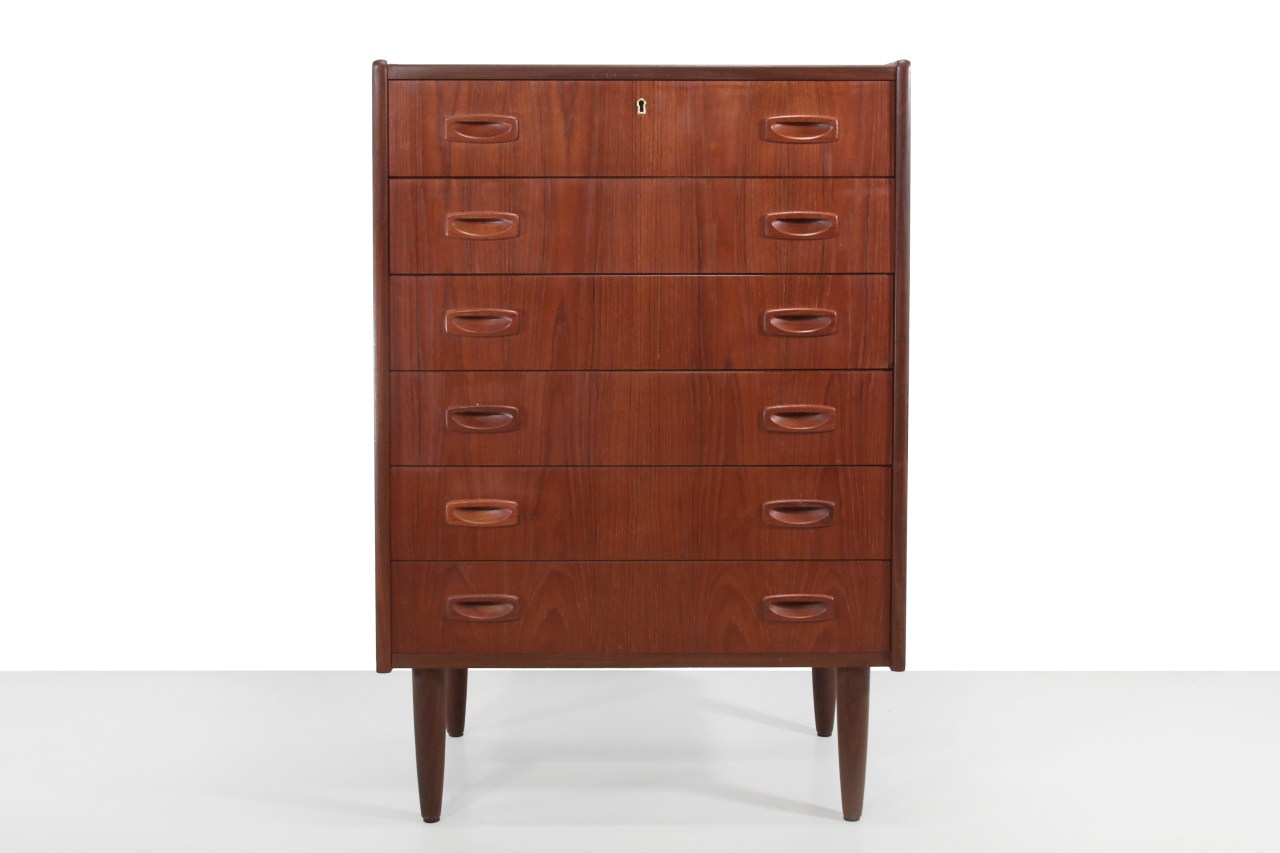 Omschrijving: Vintage Deens design ladenkast met 6 lades. Uitgevoerd in teak fineer en massief teak houten pootjes. Deze kast heeft prachtige diepliggende greepjes. Van deze hoogte vinden wij deze kasten niet vaak meer. Deze kast kan eventueel ook goed gebruikt worden als commode. De kast is 102cm hoog, 70cm breed en 40cm diep.