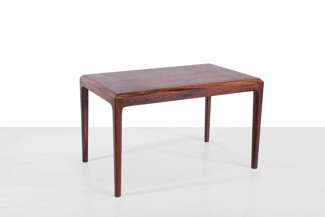 Omschrijving: Prachtig vormgegeven bijzettafel van Johannes Andersen voor Silkeborg Møbelfabrik. Gemaakt van massief palissander en een palissander gefineerd blad. De tafel heeft een hele minimale vormgeving, maar spreekt toch uit middels de prachtige details. Zo heeft het blad prachtige afgeschuinde hoeken en lopen de pootjes taps toe deels hoekig en deels rond af. De details brengen deze tafel echt naar een hoger niveau, en dan hebben we het nog niet eens over de prachtige tekening in het hout gehad. Dit tafeltje is 60 cm breed, 37 cm diep en ook 37 cm hoog.