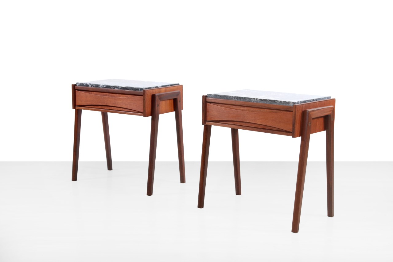 Omschrijving: Een paar Deense teakhouten nachtkastjes uit de jaren 60 toegeschreven aan Arne Vodder voor Sibast. Met prachtig gevormde lades en een marmeren tafelblad. Deze kastjes kunnen perfect gebruikt worden als nachtkastjes of bijzettafels.