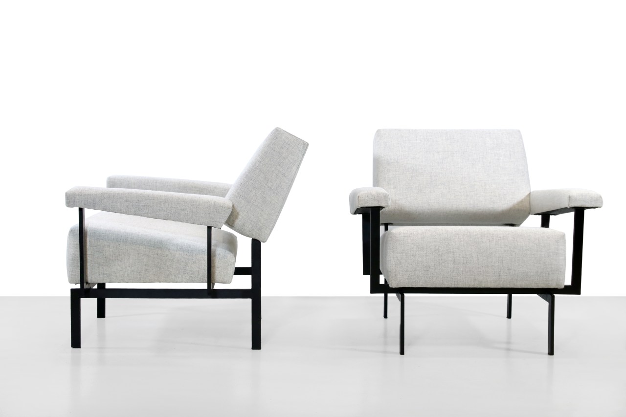 Omschrijving: Een paar prachtige Nederlands minimalistische design fauteuils ontworpen door Cees Braakman in het eind van de jaren 50 en geproduceerd door UMS Pastoe. Deze fauteuils zijn in de catalogi bekend onder modelnaam FM07. Deze stoelen zijn voorzien van nieuw schuim en ze zijn gestoffeerd met Kvadrat Tonica 2 kleur 111 wat een mooie gemêleerde wit grijze stof is van 100% wol. Hierdoor kun je weer jaren plezier hebben van deze design klassiekers. Elke fauteuil is 75 cm hoog, 75 cm breed en heeft een zithoogte van 40 cm.