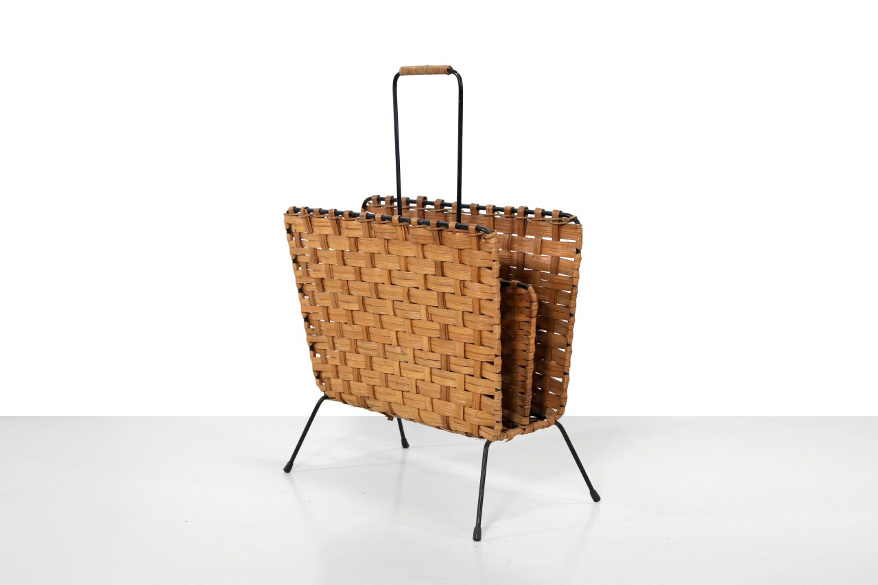 Omschrijving: Mooie Franse vintage design magazinehouder met een gelakt metalen frame, omvlochten met rotan en houtfineer. Veelzijdig toe te passen in elk interieur. De afmeting is 42 cm breed, 22 cm diep en 46 cm hoog.