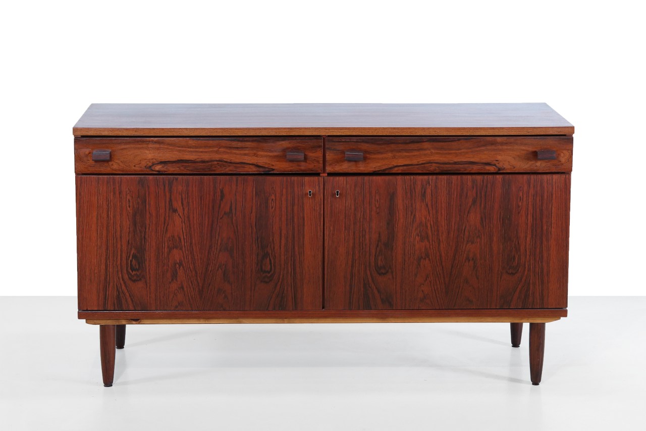 Omschrijving: Prachtige Zweeds design dressoir met twee deuren en twee lades. Uitgevoerd in Rio Palissander fineer en zeer mooi gevormde massief palissander houten greepjes en pootjes. Dit dressoirtje is niet al te breed en is dus perfect voor een wat kleinere ruimte. Door het palissander is deze kast donker van kleur met een prachtige dramatische tekening in het hout. Dit dresoir is 125 cm breed, 68 cm hoog en 42 cm diep.