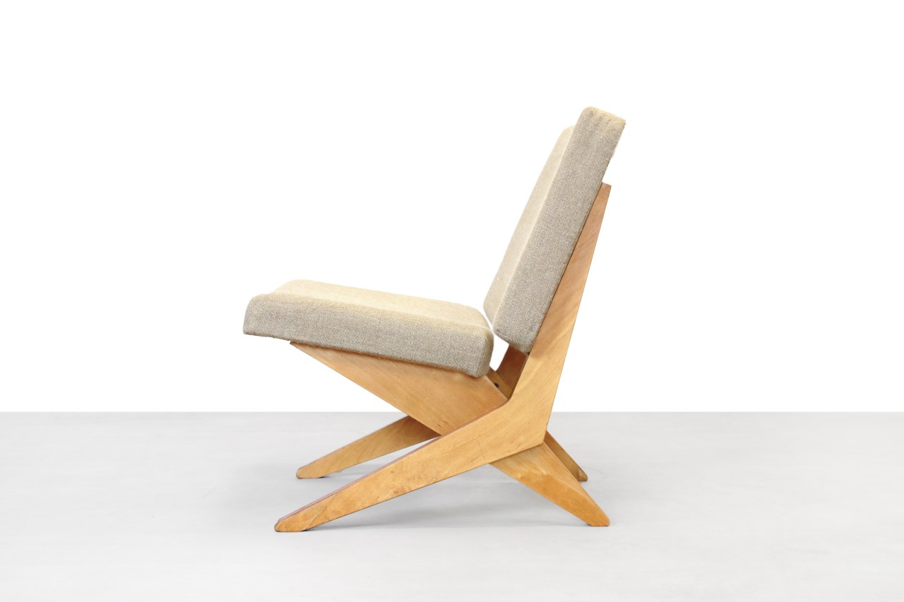 Omschrijving: Zeldzame fauteuil van Jan van Grunsven voor Pastoe. De stoel heet eigenlijk FB18, maar is omgedoopt tot de Scissor chair vanwege de vorm van het berkenhouten frame. De fauteuil heeft een mooie kwaliteit meubelstof met een grove geweven motief.