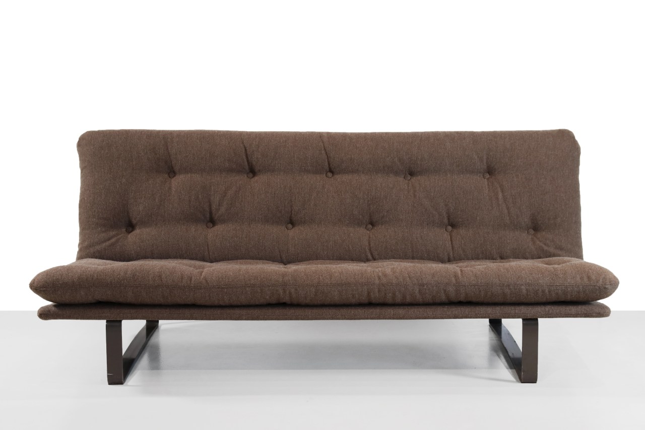 Omschrijving: Prachtige Nederlands Modernistische bank ontworpen door Kho Liang Ie in de jaren 60 voor Artifort. Deze bank draagt modelnaam C684 en is opnieuw gestoffeerd in een prachtige bruine wollen meubelstof van De Ploeg. Je hebt hierdoor het voordeel dat je kunt genieten van een prachtige designbank uit de jaren 60 van de vorige eeuw, maar met nieuw schuim en stof waardoor de bank nog weer jaren mee kan gaan. De bank zit erg comfortabel door de perfecte hoek en de volle gecapitonneerde kussens. Deze bank is 180 cm breed, 87 cm diep en 78 cm hoog met een zithoogte van 38 cm.