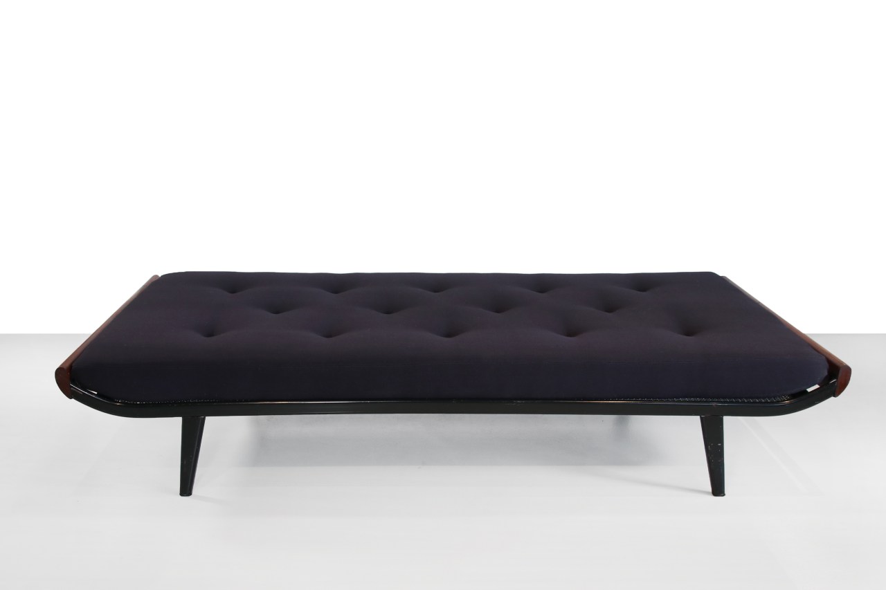Omschrijving: Erg mooi en gewild daybed uit de jaren 50 van Dick Cordemeijer voor Auping. Het model wordt ook wel Cleopatra genoemd. Het bed is gemaakt van zwart metaal en heeft massief teakhouten zijkanten. Het daybed is voorzien van een nieuw matras van hoogwaardig schuimrubber en is bekleed met een 100% wollen zwarte stof. Het matras is gecapitonneerd. Dit daybed kan ook zeer goed als bank gebruikt worden. Het bed is in totaal 210 cm lang, 90 cm breed en 40 cm hoog.