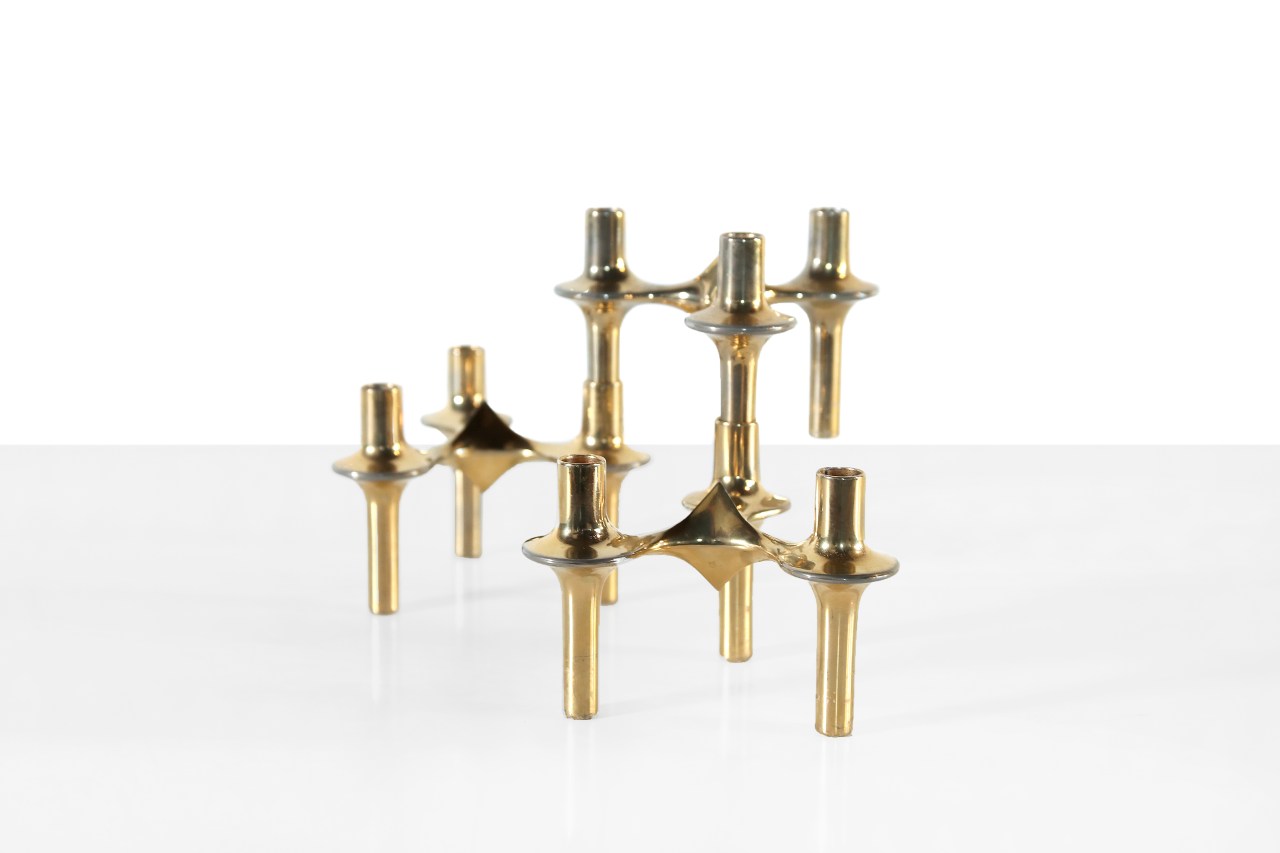 Omschrijving: Prachtige messing kleurige stapelkandelaars ontworpen door Ceasar Stoffi voor Fritz Nagel in 1965. Deze kandelaartjes zijn inmiddels uitgeroepen tot designklassieker. Dit model draagt de naam Orion en is op verschillende manieren te stappelen om zo een uniek beeld te creëren. Ook zonder kaarsen is het een prachtige woonaccessoire voor in huis.