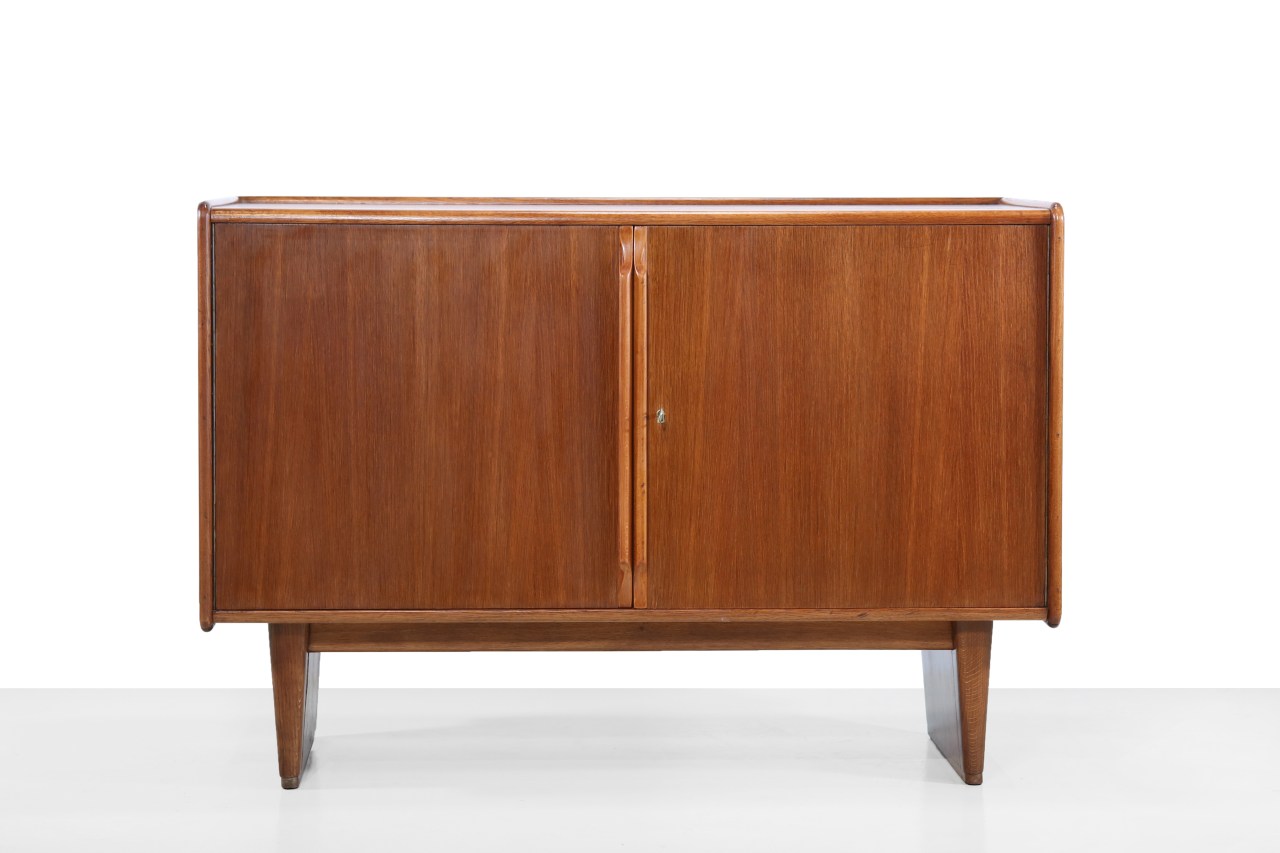 Omschrijving: Zeldzame variant op de DE01 cabinet van Cees Braakman voor Pastoe uit het begin van de jaren 50, is dit model met de twee deuren. Naar alle waarschijnlijkheid in opdracht gemaakt zoals dat toentertijd ging. Dit dressoir uit de zogenoemde eikenserie van Cees Braakman staat op twee slanke hoge pootjes en heeft achter de deuren één brede plank.