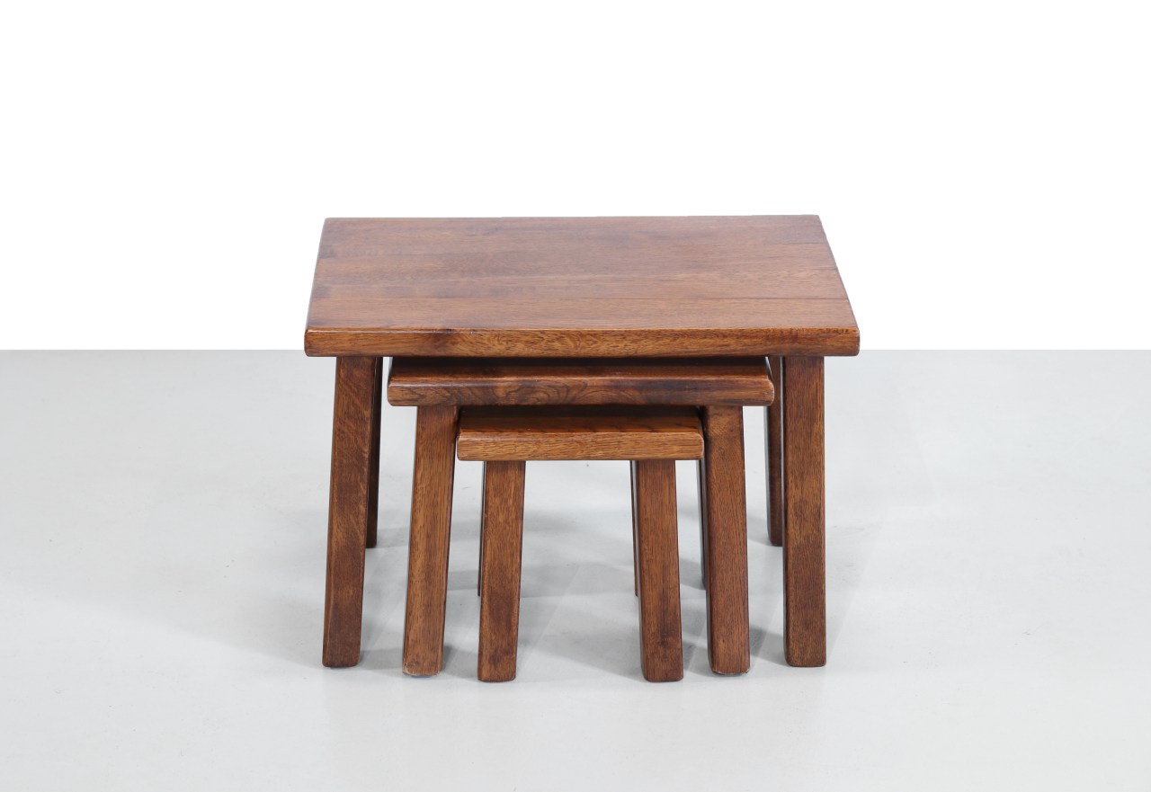 Omschrijving: Mooie set van drie massief eiken tafeltjes. Deze brutalistische set kan handig onder elkaar geschoven worden zodat ze niet te veel ruimte innemen. Ze kunnen ook los in de ruimte geplaatst worden.