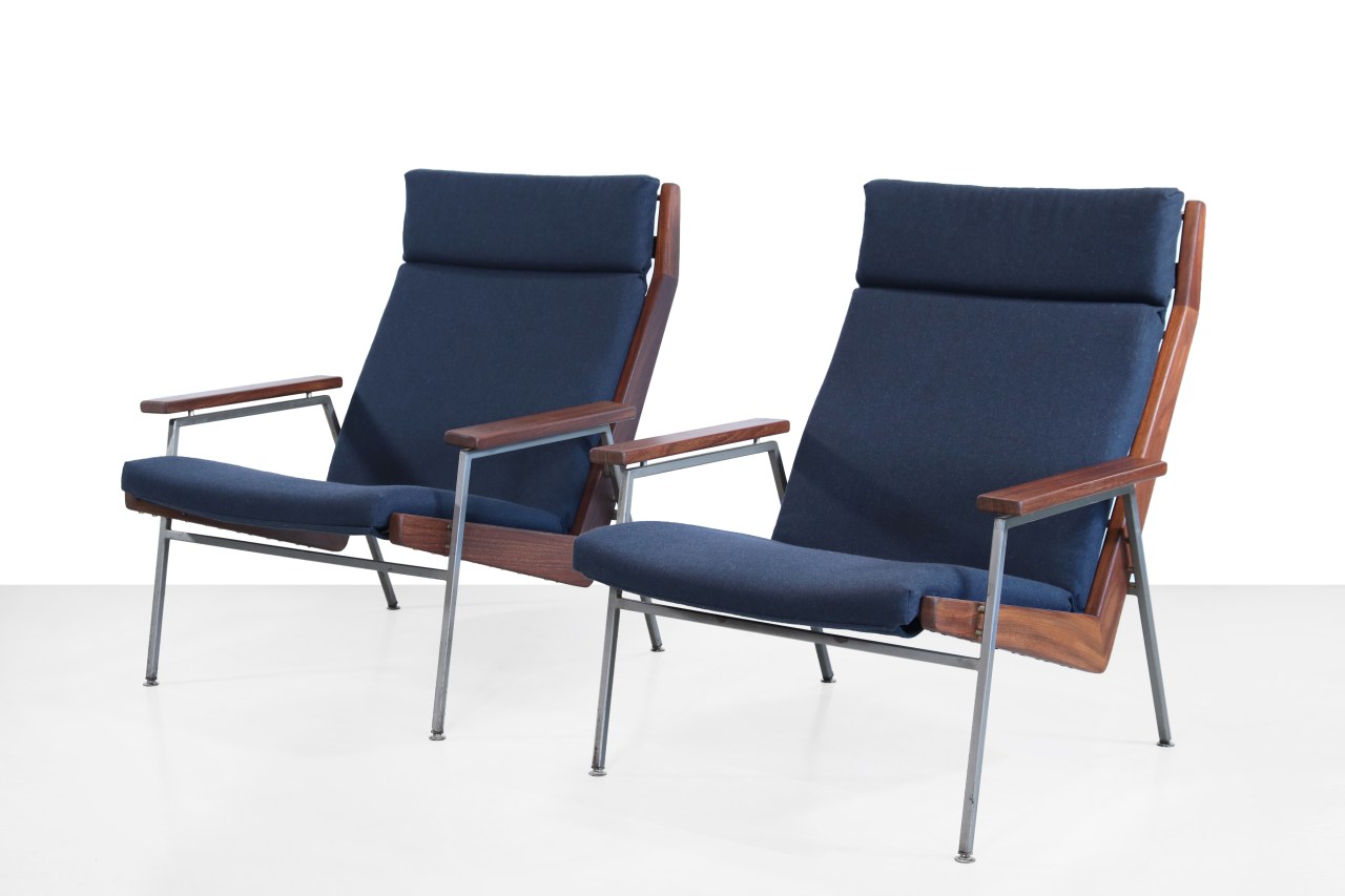 Omschrijving: Een set van 2 ‘Lotus’ fauteuils van Rob Parry voor Gelderland. Het model is gemaakt van een stalen onderstel, massief teakhouten frame, rubberen singels en gestoffeerde schuimrubberen kussen. De blauwe De Ploeg stof is 100% wol. Deze twee iconen hebben een prachtig Nederlands minimalistisch ontwerp en zitten heerlijk. Echt een aanwinst voor elk interieur. De fauteuils zijn 84 cm hoog, 69 cm breed en 75 cm diep.