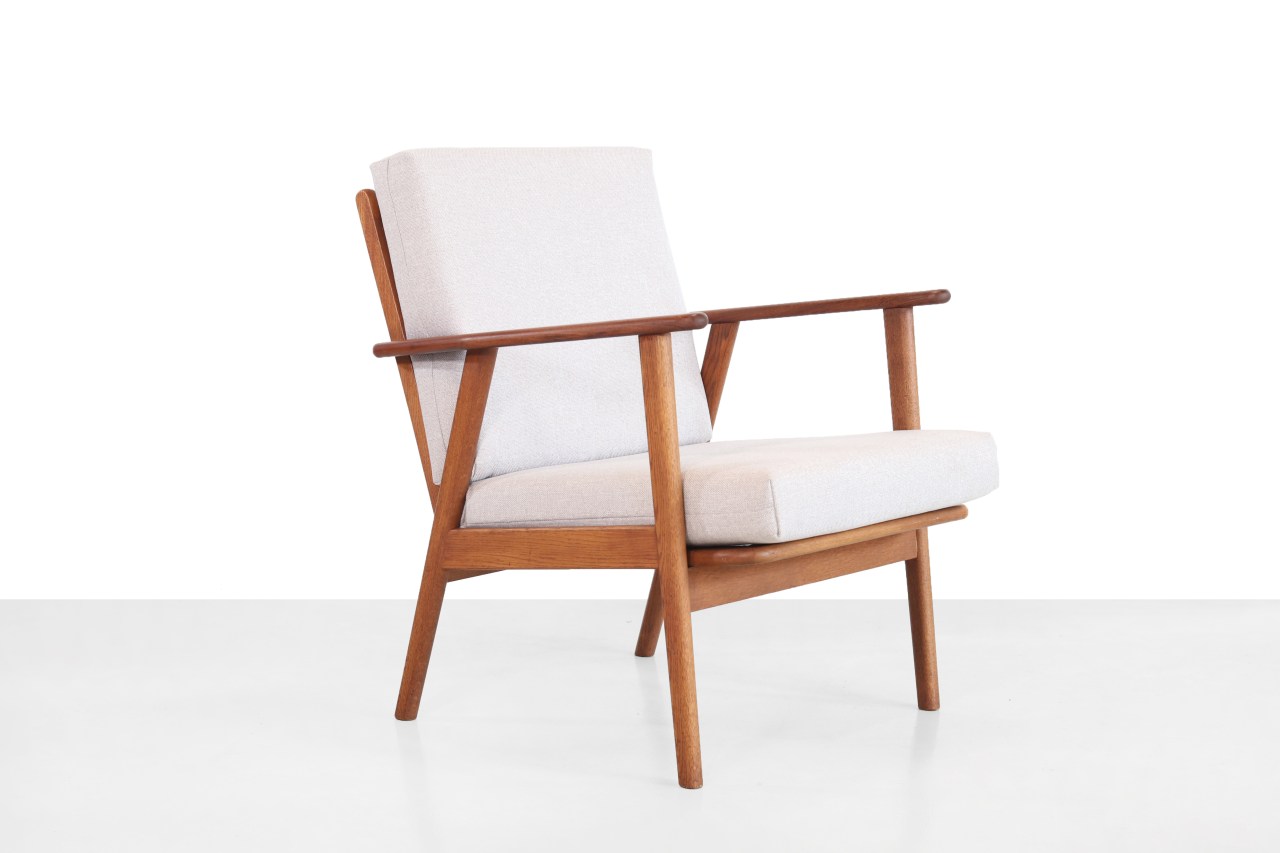 Omschrijving: Mooie Deens design fauteuil met prachtige organische vormgeving met teakhouten armleuningen en een eiken houten frame. Deze fauteuil heeft veel weg van het ontwerp van Hans Wegner waarbij ook gebruik gemaakt is van twee soorten hout. De kussens zijn bekleed met een mooie licht grijze meubel stof. De fauteuil is 67 cm breed, 72 cm hoog in totaal 65 cm diep en ze hebben een zithoogte van 41 cm.