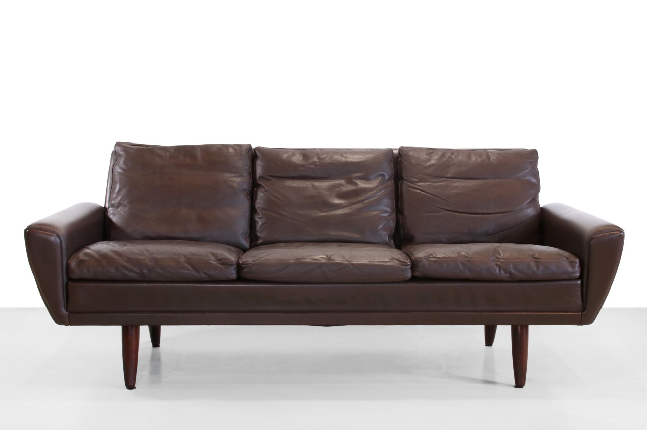 Omschrijving: Bijzonder mooie bruin leren bank van Georg Thams uit Denemarken. Deze driepersoons sofa draagt de naam: ‘Model 64’ omdat deze ontworpen is in 1964. Georg Thams heeft in de jaren 60 veel samengewerkt met bekende Deense ontwerper Kai Kristiansen. De bank is uitgevoerd in bruin leer en heeft prachtige massief palissander pootjes. In de kussens zitten donsveren waardoor de bank erg lekker zit. Kortom een prachtige bank van super Deense kwaliteit. De bank is gemerkt, zie foto.