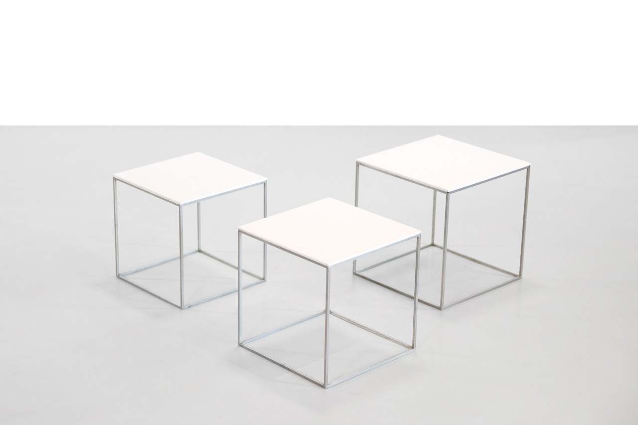 Omschrijving: Prachtige set modernistische bijzettafels ontworpen door Poul Kjaerholm. Geproduceerd door Kold Christensen in het eind van de jaren 50 in Denemarken. Deze tafels worden model PK71 genoemd en zijn gemaakt van kubistische stalen frames met witte acryl bladen. De bladen zijn origineel. Alleen het grootste blad vertoond een donker krasje, zie foto. Het frame is gemerkt met Denmark. In elkaar geschoven zijn de tafels 28 cm bij 28 cm.