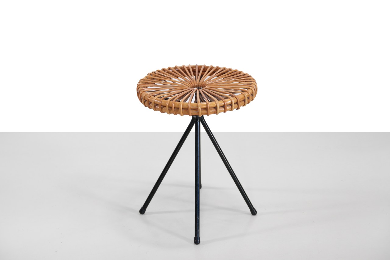 Omschrijving: Erg mooie minimalistische kruk van Dirk van Sliedrecht voor Rohe Noordwolde. Bijzonder is de met rotan omtrokken zitting. Het krukje staat op vier zwart gelakte stalen pootjes. Een echte eye-catcher. Bedoelt als kruk, maar kan ook goed gebruikt worden als bijzettafel of plantentafel. Het krukje is 48 cm hoog en 38 cm in doorsnede.