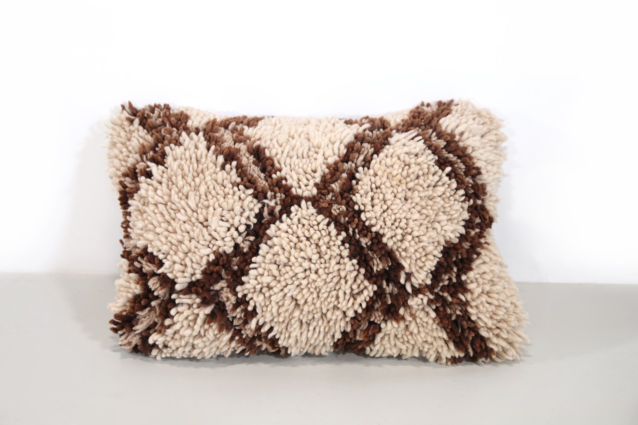 Omschrijving: Prachtig Berber kussen uit Marokko met een witte wollen basis in combinatie met bruine ruiten. Dit kussen is handgeknoopt en heeft een canvas achterkant. Deze kussens komen uit het Atlasgebergte uit Marokko en hebben een afmeting van 62 bij 35 cm.