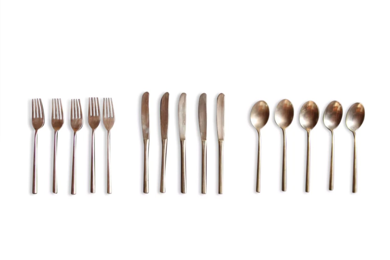 Omschrijving: Vintage messing bestek set afkomstig uit Denemarken. De set bestaat uit 5 messen, 5 vorken en 5 lepels.