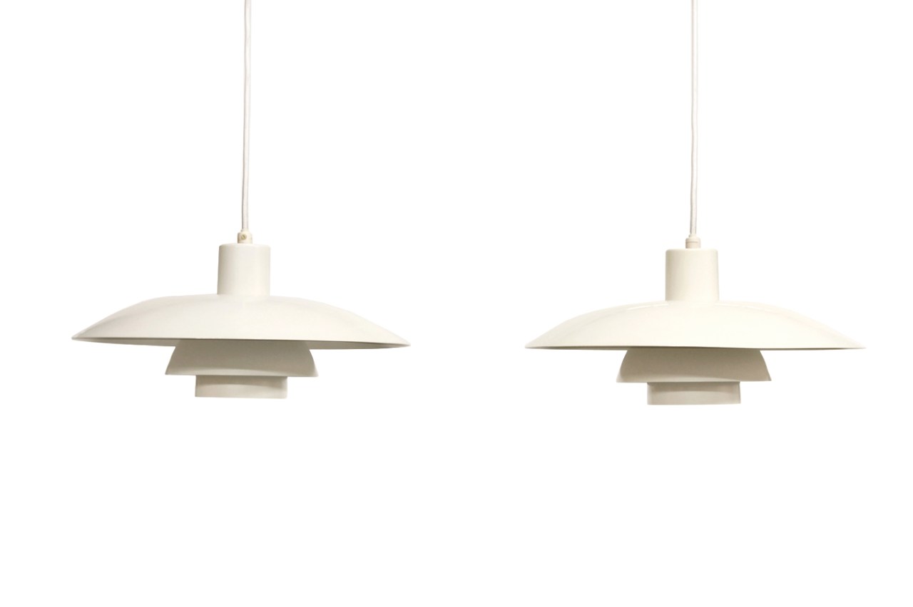 Omschrijving: Twee vintage hanglampen van Poul Henningsen voor Louis Poulsen. Deze lampen dragen de naam PH 4/3. De lampen zijn zo ontworpen dat je een maximale verspreiding van het licht hebt en zo min mogelijk schittering in je ogen. De lampen zijn erg mooi als set boven bijvoorbeeld een grote eetkamertafel.