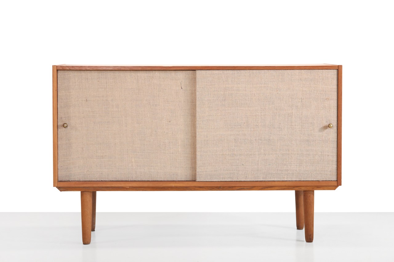Omschrijving: Vintage eiken dressoir uit Denemarken. Deze kast is gemaakt van deels massief en deels gefineerd eikenhout en heeft twee prachtige jute schuifdeuren. Een mooi detail zijn de gepatineerde messing knopjes. Het ontwerp doet ons erg denken aan een Knoll dressoir. Wij hebben dit dressoir in Denemarken gekocht, maar weten helaas niet wie hem ontworpen heeft. Het dressoir is 77cm hoog, 122cm breed en 40cm diep.