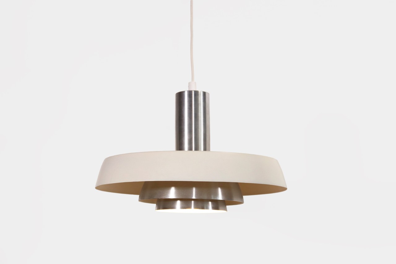 Omschrijving: Mooi minimalistische design hanglamp uit Denemarken. Gemaakt van blank en grijs gelakt aluminium. De lamp heeft drie schalen die het licht mooi verspreiden. De lamp heeft een diameter van 35 cm en is 25 cm hoog. De kabel is vernieuwd en is 215 cm lang.