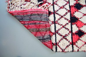 Omschrijving: Prachtig Berber tapijt uit Marokko. Dit tapijt is een echt oude Azilal handgeknoopt van natuurlijk geverfde wol. Dit kleed wordt gekarakteriseerd door een abstract geometrisch motief, in dit geval: zwarte en rode ruiten en lijnen. De Berber tapijten zie je de laatste tijd vaker in het interieur verschijnen, en dat is niet gek: de Marokkaanse kleden voelen zeer warm, zacht en comfortabel aan, en geven persoonlijkheid en karakter aan je interieur. Veel tapijten die je nu ziet zijn nieuw en soms vaak machinaal gemaakt. De oude tapijten herken je aan de 100% pure wol op wol en de afmeting. De echte vintage tapijten uit de Hoge Atlas zal je niet breder vinden dan 220 cm. Dit tapijt is 370 lang x 170 cm breed en ondanks dat het een zeer oud tapijt is, een prachtige tijdloze toevoeging aan uw interieur.