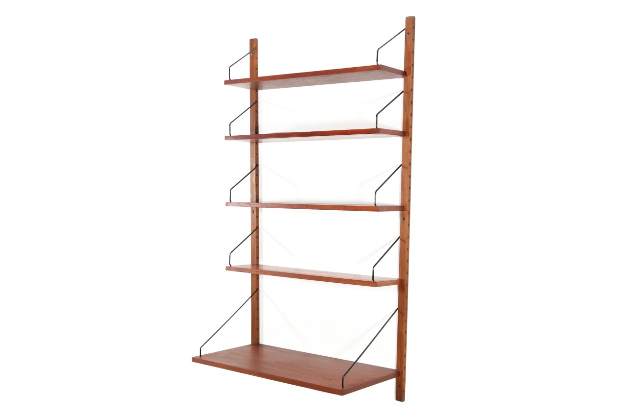 Omschrijving: Erg mooie teakhouten wandsysteem van Poul Cadovius voor Royal System uit Denemarken. Deze wandkast bestaat uit 2 staanders, 4 teakhouten planken en een diep blad welke eventueel gebruikt kan worden als bureau. Met dit systeem kun je je kast handig en snel naar eigen smaak indelen. Het is niet alleen een pracht object in huis, maar ook nog eens heel functioneel. Gebruik deze set voor aan een smalle muur, of om een reeds bestaand systeem uit te breiden. De twee staanders zijn 150 cm hoog. De planken zijn 80 cm breed en 20 cm diep. De totale hoogte en breedte van de kast zoals afgebeeld op de foto is 150 bij 85 cm.