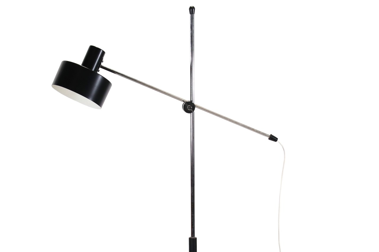 Omschrijving: Staande vloerlamp welke zowel in hoogte als diepte verstelbaar is. De lamp heeft een zwarte kap en een zwarte voet. De lamp is 145 cm hoog en de arm is 68 cm lang. De diameter van de zwarte kap is op zijn breedst 17 cm in diameter.