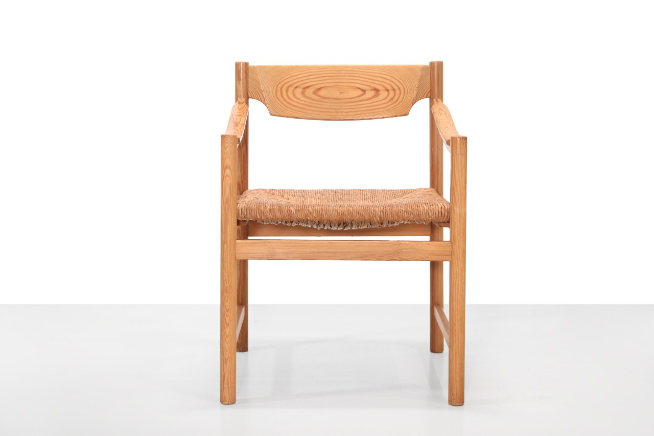 Omschrijving: Mooie stoel gemaakt van massief dennenhout met gevlochten zitting. De stoel heeft veel weg van de Carimate stoel ontworpen door Vico Magistretti. Helaas is de stoel ongemerkt en weten wij nog niet wie de ontwerper is.