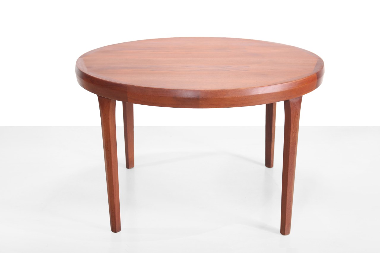Omschrijving: Prachtige ronde verlengbare eetkamer tafel ontworpen door Ib Kofod Larsen voor Faarup møbelfabrik, Denemarken. De tafel is gemaakt van teak fineer en massief teak hout. Deze tafel heeft 2 extra bladen. Helemaal uitgeschoven is er plaats voor ruim 8 personen. Een erg mooi detail aan deze tafel is de brede rand met geometrische vormgeving en de geometrische vormgeving in de poten. Ook heeft de tafel een waanzinnige tekening in het hout. De tafel is 120 cm in diameter en 74 cm hoog. Elk blad is 50 cm breed. Maximaal verlengd is de tafel 220 cm lang.