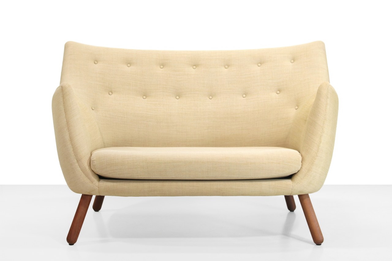 De Poet Sofa is gevormd in een prachtige ronding die de zittende persoon bijna lijkt te omarmen. Het gecapitonneerde frame is volledig gestoffeerd en creëert een knusse zit voor twee personen. Deze bank is het resultaat van Finn Juhl’s ambitie om functionele meubels te maken voor kleinere appartementen. De bank is 136 cm breed, 80 cm diep en 87 cm hoog.