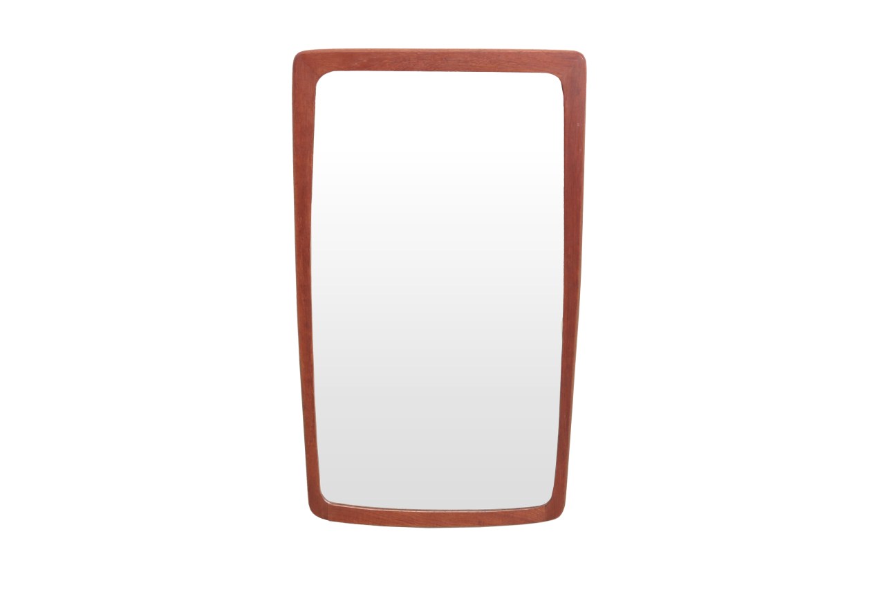 Omschrijving: Mooie Deens design spiegel gemaakt van massief teakhout. Deze spiegel heeft een typische mid century modern vormgeving. Praktische woonaccessoire maar meteen ook een lust om te zien. Hang hem bijvoorbeeld in de gang, of in de slaapkamer.