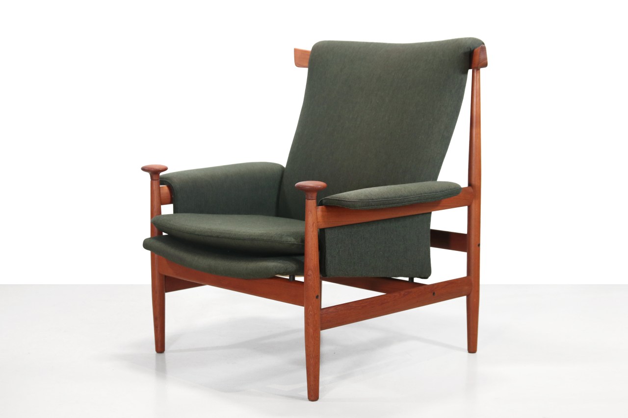 Omschrijving: Iconische fauteuil ontworpen door bekende Deense ontwerper Finn Juhl en geproduceerd door France and Son in de jaren 60. Finn Juhl liet zich inspireren door abstracte sculpturen en Afrikaanse kunst. Dat laatste is ook goed terug te zien in deze fauteuil genaamd Bwana, ook wel bekend als model 152. Deze fauteuil is gemaakt van massief teakhout waarin de kussens en armleuningen lijken te hangen. De groene wollen stof is nog compleet origineel, maar het schuim is door ons vervangen. Het concept van Finn Juhl bij deze stoel: “being carried en caring” heeft gezorgd voor deze ergonomische vormgeving die erg comfortabel is. De sculpturele benadering heeft ervoor gezorgd dat deze stoel eruitziet als functionele kunst en functioneert als een troon voor het menselijk lichaam. De fauteuil is 91 cm hoog, 88 cm diep en 88 cm breed.