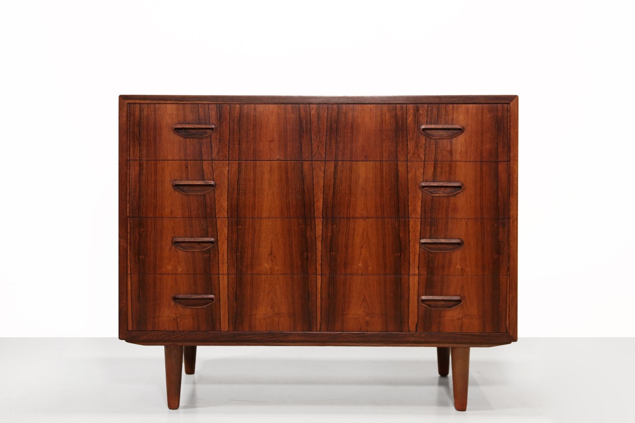Omschrijving: Prachtige Palissander houten ladekast uit Denemarken. Gemaakt van palissander fineer en massief palissander details met een uitzonderlijk mooie tekening in het hout. Deze kast heeft 4 lades en is te gebruiken op meerdere plekken in het huis. Deze kast is 90 cm breed, 40 cm diep en 73 cm hoog.