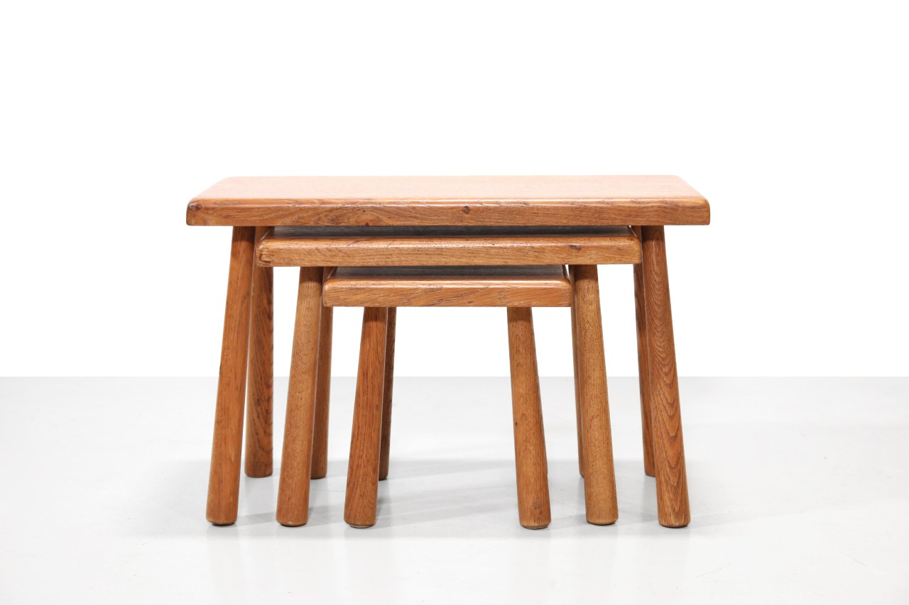 Omschrijving: Mooie set van drie massief eiken tafeltjes. Deze brutalistische set kan handig onder elkaar geschoven worden zodat ze niet te veel ruimte innemen. Ze kunnen ook los in de ruimte geplaatst worden. Het grootste tafeltje kan eventueel ook als bankje fungeren. De tafeltjes zijn zeer ambachtelijk gemaakt en van goede kwaliteit. Hier stond deze fabrikant ook om bekend. Mooi aan deze rechthoekige set zijn de conische pootjes die wijd uitlopen. Het grootste tafeltje is 63 cm breed, 30 cm diep en 43 cm hoog.