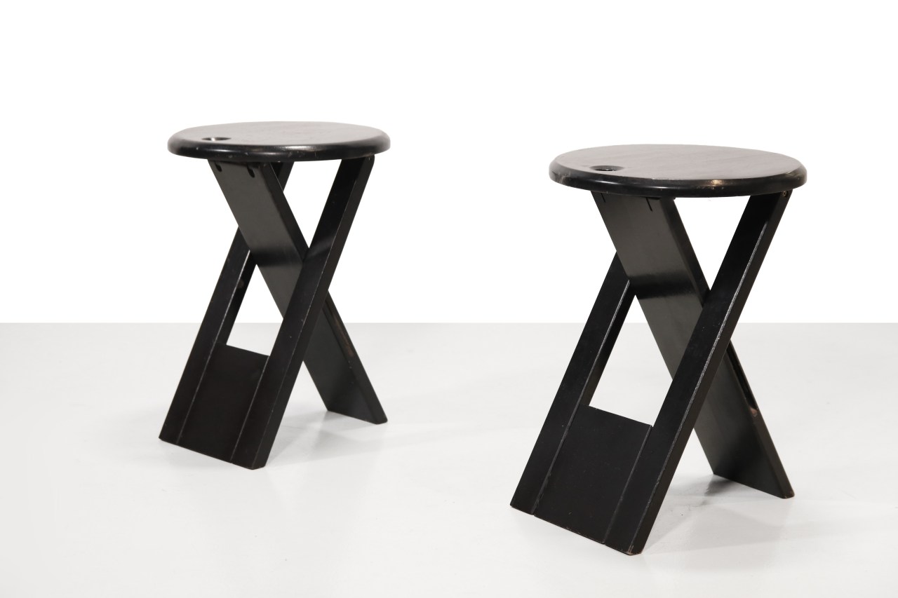 Omschrijving: Praktische vouwbare kruk ontworpen door industrieel designer Roger Tallon in de jaren 70. De zwart gelakte krukken zijn geproduceerd door fabrikant Sentou uit Frankrijk. De designer heeft deze kruk ontworpen met het idee om maximaal en daardoor ook zo economisch mogelijk gebruik te maken van materiaal. Gesneden uit een enkel paneel, en super eenvoudig te vouwen tot een dunne kruk om op te bergen. Het design is zo goed ontworpen dat het niet inlevert op stevigheid en er door het lijnenspel ook nog eens aantrekkelijk uitziet. Super degelijk, functioneel, praktisch en mooi tegelijk. Door het gat in de zitting kun je hem makkelijk vasthouden of ophangen. De kruk is ook zeer geschikt als bijzettafel of plantentafeltje. De kruk is 46 cm hoog en heeft een diameter van 30 cm.