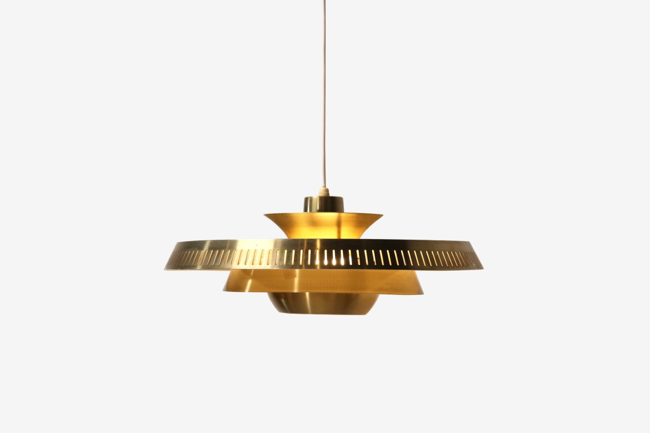 Omschrijving: Mooie vintage messing kleur Deens design hanglamp in de stijl van fabrikanten Fog and Morup of Poul Henningsen. Dit model is gemaakt van aluminium en heeft een goudkleurige coating waardoor het lijkt op messing. De grootste ring is geperforeerd wat een mooi effect geeft op de muur. De lamp is ongeveer 25 cm hoog en 45 cm in diameter.