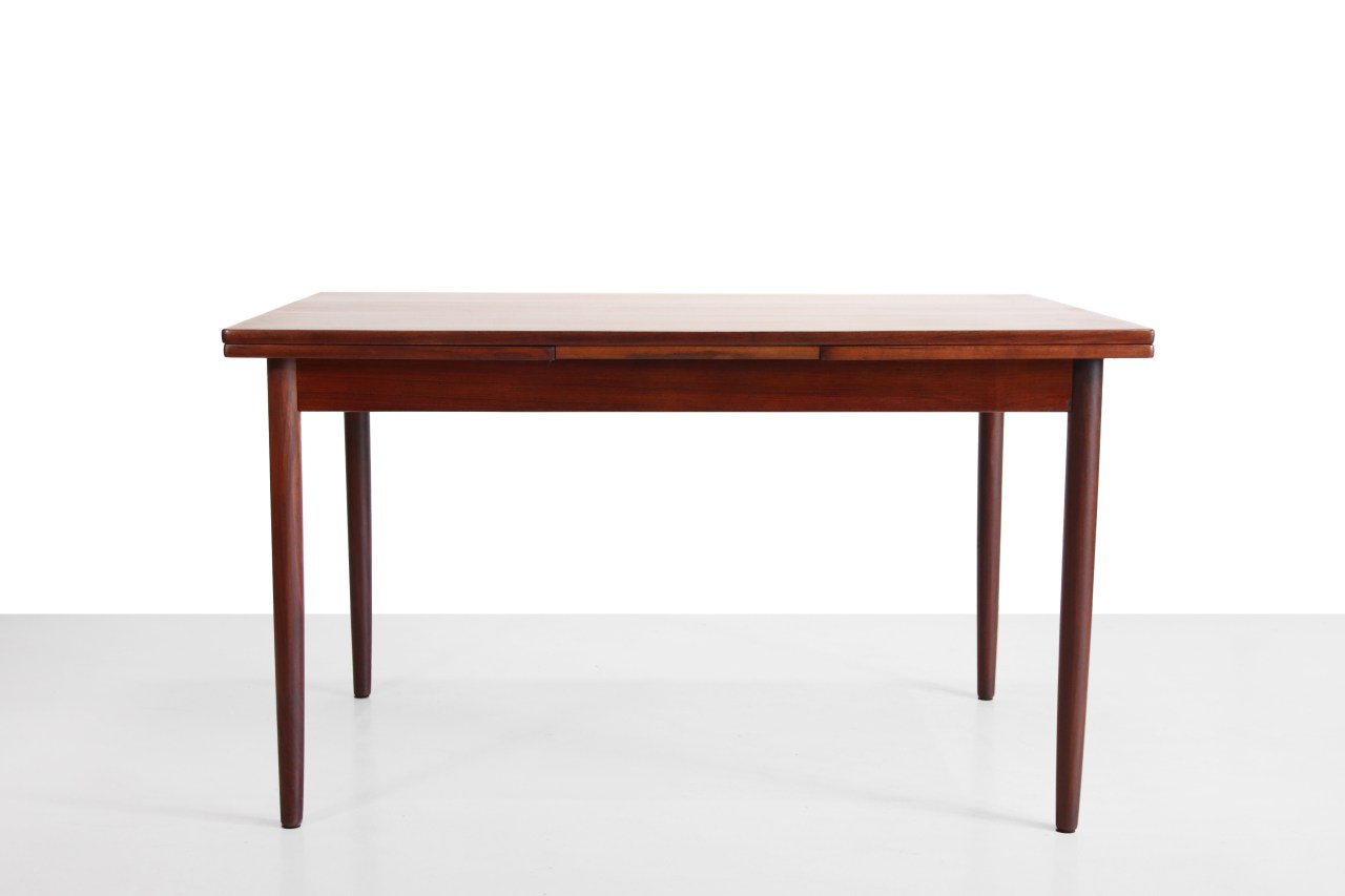 Omschrijving: Vintage Deense uitschuifbare eetkamertafel uitgevoerd in palissander. De extra bladen zijn mooi geïntegreerd in het ontwerp opgeborgen onder het blad. De tafelbladen zijn mooi afgewerkt met massief houten randen. Dit heeft er onder andere voor gezorgd dat de tafel nog in zo’n goede staat is. De tafel kan mooi gecombineerd worden met de Palissander Moller stoelen die we op dit moment ook te koop aanbieden. Deze eetkamertafel is 130 cm lang, 84 cm diep en 75 cm hoog. Elk extra blad is 46,5 cm in lengte. Totaal uitgeschoven is deze tafel dan ook 223 cm lang.