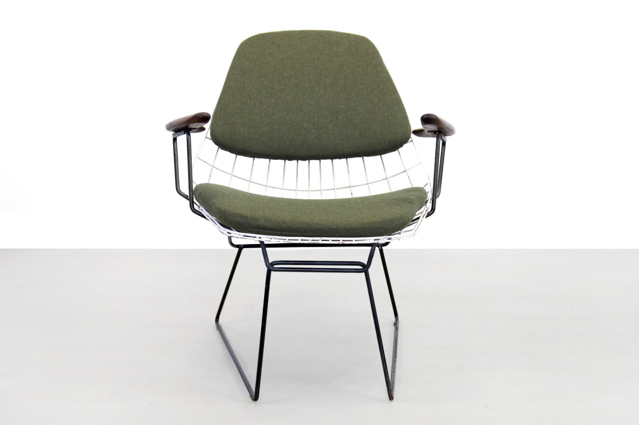 Omschrijving: Mooie originele vintage draadmetalen fauteuil van Cees Braakman en Adriaan Dekker geproduceerd door Pastoe. Dit model is vanuit de fabriek vernoemd naar model FM06. De Pastoe FM06 Wire stoel werd in 1958 ontworpen door Cees Braakman. Spraakmakend aan deze stoel was dat het een van de eerste collecties werd die volledig uit draadstaal werd gemaakt. Dit model heeft prachtige teakhouten armleuningen en opnieuw gestoffeerde kussens in groen wol vilt. Zo worden ze vandaag de dag niet meer gemaakt. Dit is een echt oud originele fauteuil, die Cees Braakman wellicht zelf nog in zijn handen heeft gehad met prachtige patina aan het metaal. De fauteuil is 85 bij 61 bij 50 cm. De zithoogte is 36 cm.