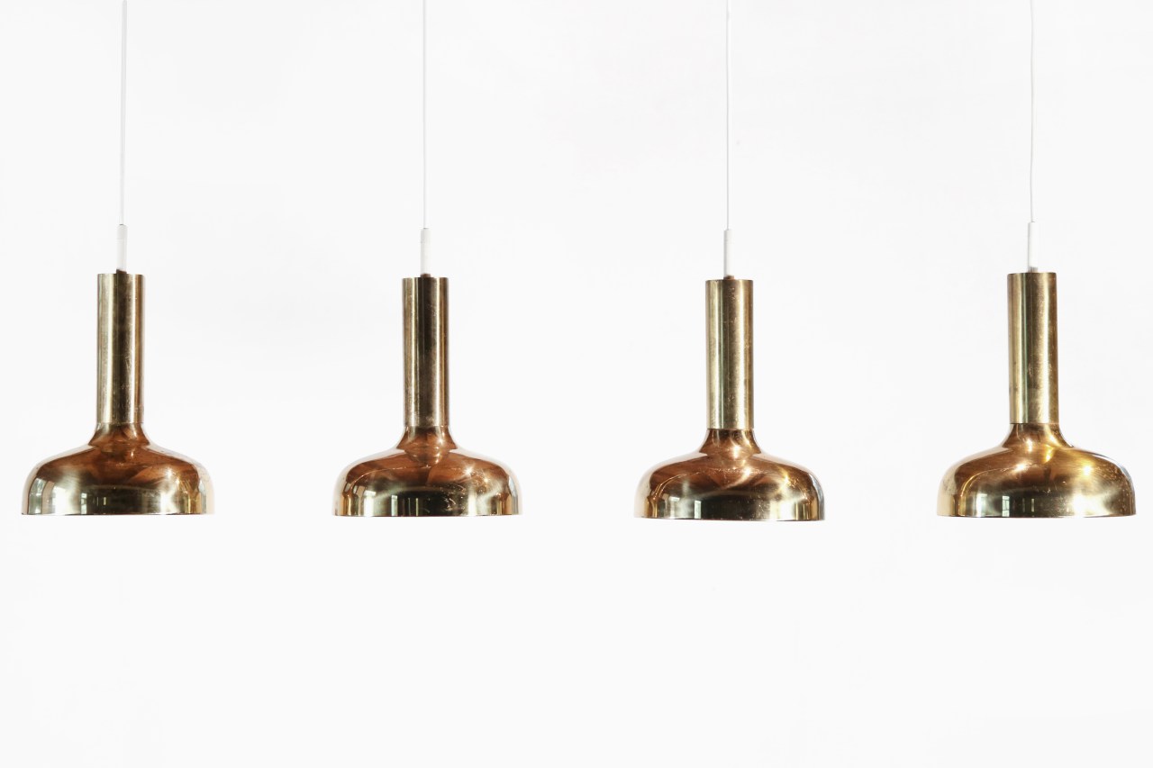 Omschrijving: Prachtige set spots gemaakt van massief messing. De lampen lijken erg op het ontwerp van Wilhelm Lauritzen voor Louis Poulsen maar zijn in de jaren 60 geproduceerd door Sölken Leuchten in Duitsland en onder andere ook verkoopt door Massive in België. De lampen zijn het mooiste met kopspiegellampjes maar je kunt er ook kleine lampjes met een E27 fitting in doen. Wij verkopen deze lampen per twee of per vier en zijn uiterst geschikt voor boven een lange eetkamertafel of voor boven bijvoorbeeld de keuken of een bar. De lampen zijn 27 cm hoog en hebben een diameter van 20,5 cm