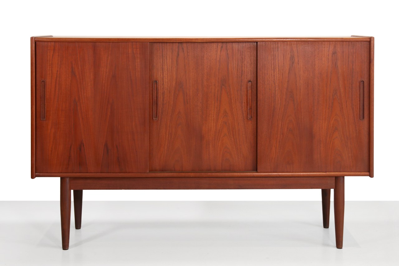 Omschrijving: Minimalistische teakhouten Deens design highboard. Gemaakt van massief teakhout en teak fineer. De kast heeft een strakke vormgeving waardoor het een tijdloos model is. Zeer geschikt voor mensen die op zoek zijn naar veel opbergruimte. De kast heeft drie schuifdeuren, de eerste twee deuren geven toegang tot een groot open vak met twee planken en achter de laatste rechterdeur kan men een legplank en twee lades vinden. De afmetingen van het Deense highboard zijn: 165,5 cm breed, 44 cm diep en 107 cm hoog.